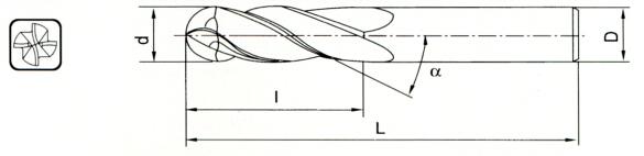 四刃球头铣刀对于需时长间切削的工具能分担刀具的磨耗,以提高被加工零件的尺寸精度,同时可提高刀具的进给,适用于HRC≤65的碳素钢,模具钢,合金钢,不锈钢,热处理钢,钛合金等的加工。