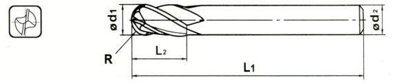 两刃球铣刀可用于等高切削或曲面切削,适用于HRC≤65的碳素钢,模具钢,合金钢,不锈钢,热处理钢,钛合金等的加工。
