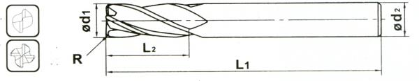 四刃圆鼻铣刀R角结构设计可保护刀尖不易崩裂,也可替代小径球头铣刀作清角或曲面等高切削,适用于HRC≦65的碳素钢,模具钢,合金钢,工具钢,不锈钢,热处理钢,钛合金等加工。